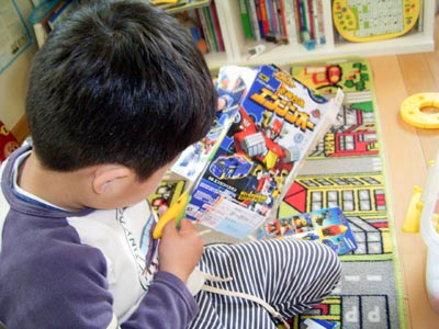 オモチャの箱を切り抜いて、 カードにする。 おママのお兄さんが大のアイドル好きなのだが、 コイツもアイドルの切り抜きを作ったりするのだろうか。 素質ありそうである。 |