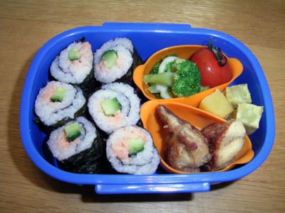 本日のお弁当。 海苔とサツマイモで食物繊維を稼いでいる。 |