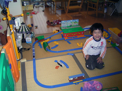 3人で作ったプラレール。 合作だけに良くできている。 |
