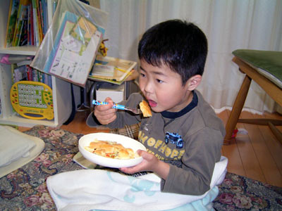 何が食べたい?の問いに、 S「ホットケーキ!」 咽せるくらい一気に食べたそうだ。 あとご飯も食べたいと言っておママに用意させたが、 さすがにホットケーキの後では、 食べることができなかったそうである。 でもみそ汁は一気に飲み干したそう。 咽が渇いていたんだな。 みそ汁は栄養満点だ。 |