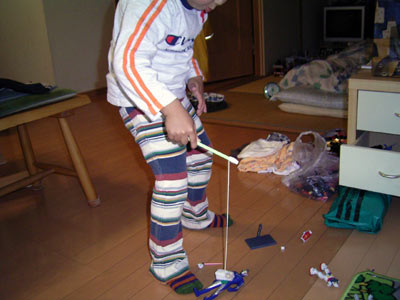 S「ロボット、釣った」 何かと思ったら、こんなことして遊んだらしい。 |