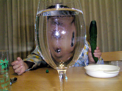 ・・・。 ちょっと怖いぞ。 揺れはしないが、ワイングラス越しにおママと対面、 顔の変形に興味津々だったそうだ。 |