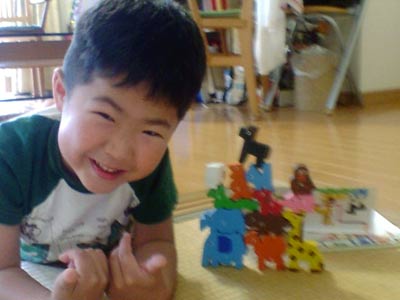久しぶりの動物積み木。 いつの間にか、 これだけ積み重ねられるようになっていた。 |