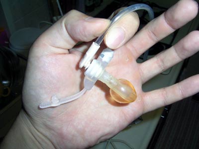 体内側のバルーンがしぼんでいる。 バルーンの水の量のチェックを怠っていた。 胃ロウ歴3年半にして、この失態。 瘻口が裂けなくてよかった。 |