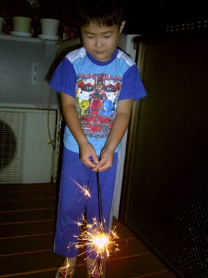 納得いかないSのため、ベランダで花火。 ウッドデッキが焦げる〜・・・。 |