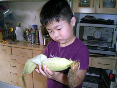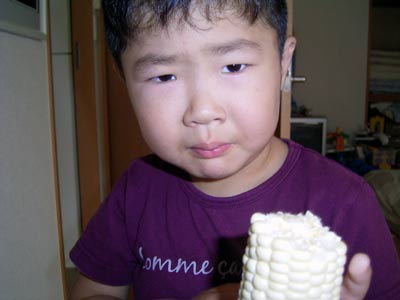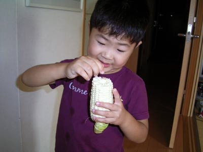 おママの実家から、おママ大好物のトウモロコシが。 |