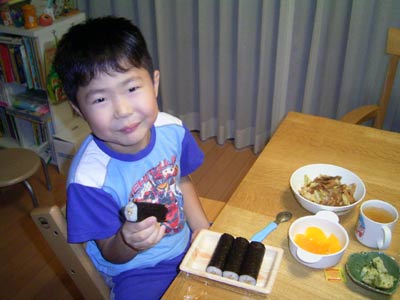 昨日SGが納豆巻を美味しそうに食べているのを見て、 S「納豆巻、食べたい!」 と苦手だった納豆を自ら志願。 与えると美味しそうに食べてしまった。 挽き割りだと食べられるようだ。 豆の食感って、そんなに妙なのだろうか。 |