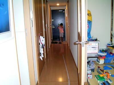 イタズラも盛んで、 メジャーを引っ張り出して玄関まで測量。 |