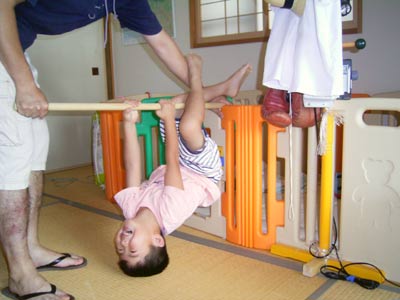 しかし鉄棒(木の棒)を回して回転を助けてあげると、 コツを掴んだのか以後自分でできるように! |