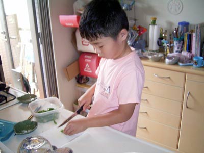 包丁の使い方もサマになってきた。 もちろん歯が付いたナイフである。 |