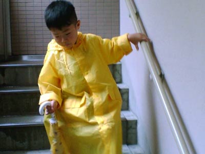 合羽姿で通園だ。 |
