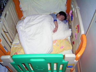 どう見ても狭そうなんだがな〜。 掛け布団が2重になってしまって、暑そうだ。 |