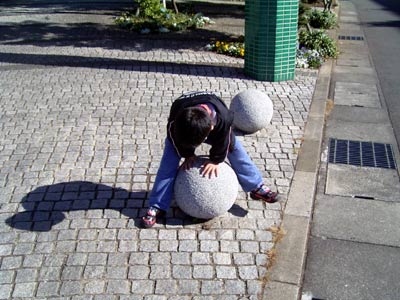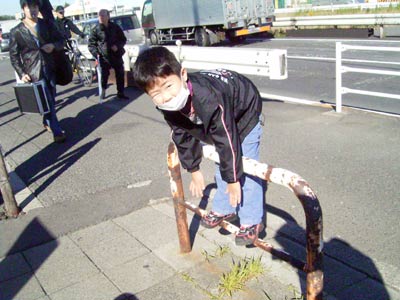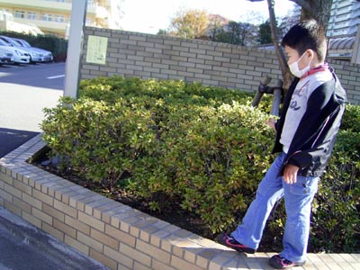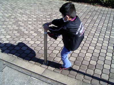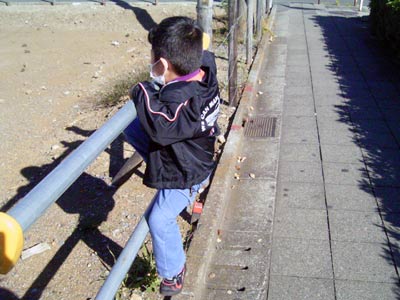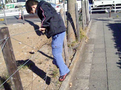 病院からの帰り道、 昨日登った柵を登って見せてくれる。 |