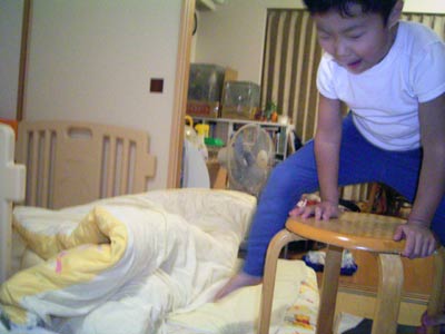 して丸椅子を持ち出して、その上に飛び乗る。