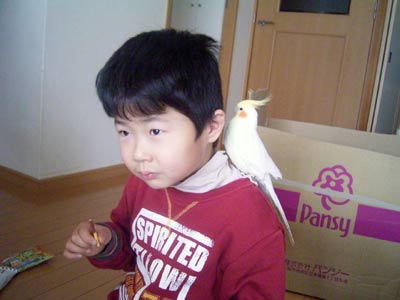 オカメにもお裾分けしつつ、 肩に乗られて緊張しつつ、 大好きなチョコ系のお菓子を味わうS。 |