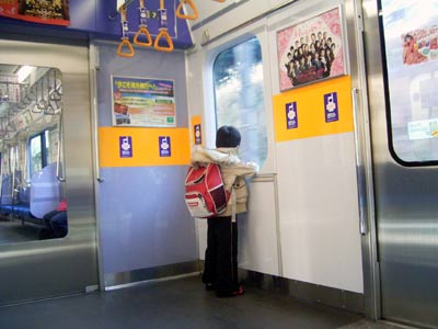 Sは電車のこの場所がお気に入り。 車両の連結部分、かつ窓が広いところ。 |