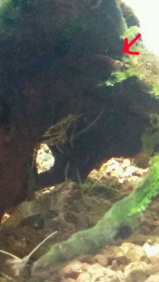 いつかの続き、底のスジエビ群とミナミの稚エビ(赤矢印)。 |