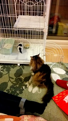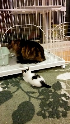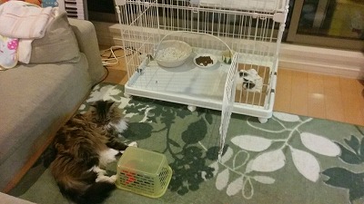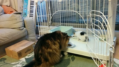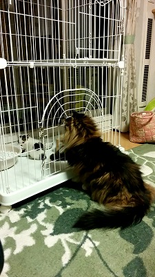 ケージの中まで手を伸ばして・・・。 隔離なんて無理無理。 |