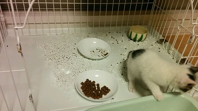Cooがメイの餌を食べるので、Cooの餌をメイの中に。 |