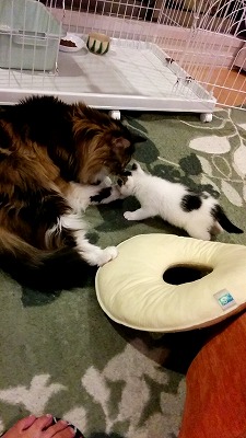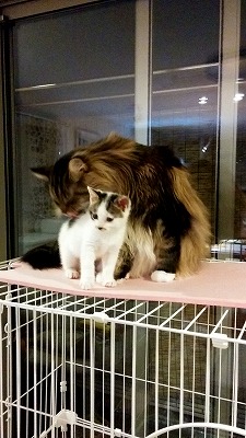 本当は良くないのだそうだが、メイをCooの側に置いてみた。 ベロベロ舐めて、歓迎している。 進歩だ。 |