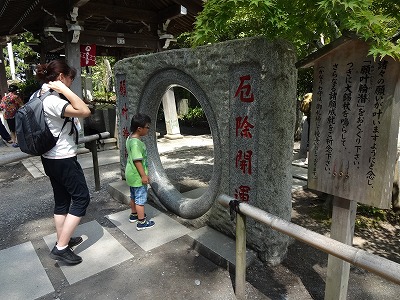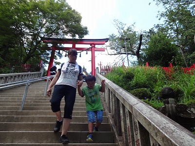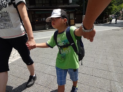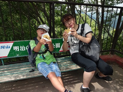 ケーブルカーを降りてすぐ、イキナリ休憩。 天狗焼き。 これがまた、タイソウ気に入ったようで、H。 |