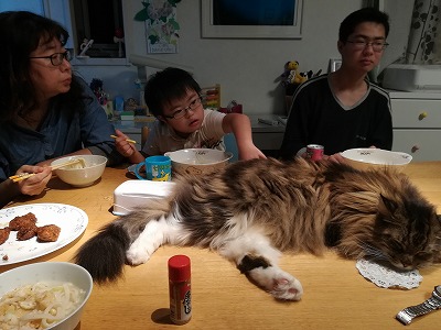 夕飯中、今日の大活躍を誇るように、デンと・・・。 |