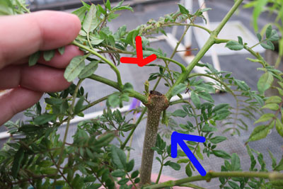 花後元気がなかったジャカランダ。 新芽が。 しかし青矢印は下に向かて生えている。 |