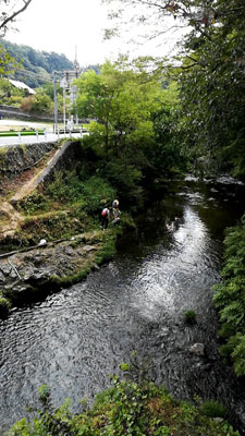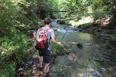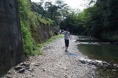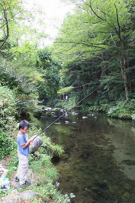 Sの希望で川に魚を釣りに。