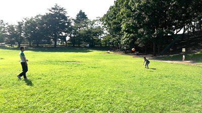 公園を横切り電車に手を振りつつ・・。 |