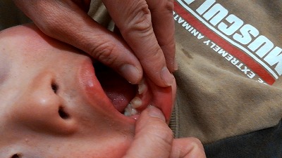 抜け跡から歯が見えてきた。 写真じゃ見えないか。 もう、あと何本だろうか。 |