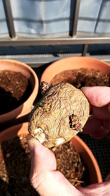 別件。 芽出しが早すぎた種ジャガイモ。 本当は1か月先だが、試しに植えてみた。 防寒はしたよ。 |