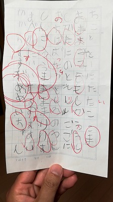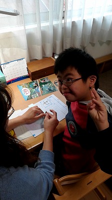 Hが自慢げに持ってきた。 おおお、しりとりになってる! リンゴが「しんご」、H語そのままだな。 「うま・・・ま、ま、ま、まり」、正直だな。 |