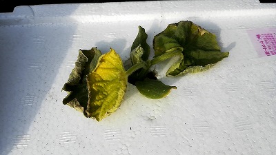 夕。 水耕栽培のキュウリ苗が、萎えている。 |