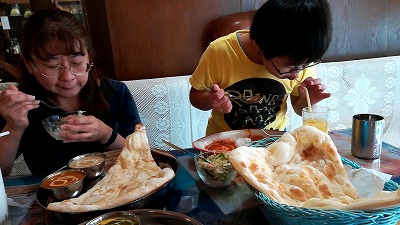 お昼ご飯。 2回目のインド。 お子様カレーを頼んだら、6歳までと断られてしまった。 なので仕方なく大人用の・・・。 |