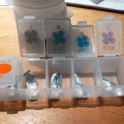 ![]() | 七夕と全く関係ないが。 Sの総合ビタミン・ミネラルのサプリ。 日曜に1週間分をセットするのだが、左が準備時、右は週末。 これだけ変質すると、気持ちもよくない。 |