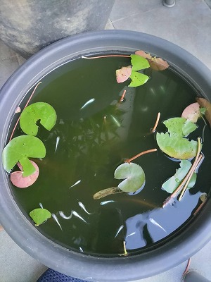 先日スイレンが引き抜かれ、メダカが盗まれているのでヤな感じ。
