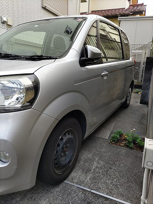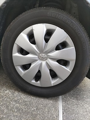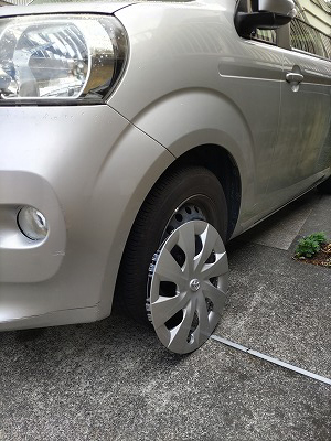 ![]() | ウチのメインの車のほう。 左前のタイヤのホイールキャップ、どこかに落としてしまった。 |