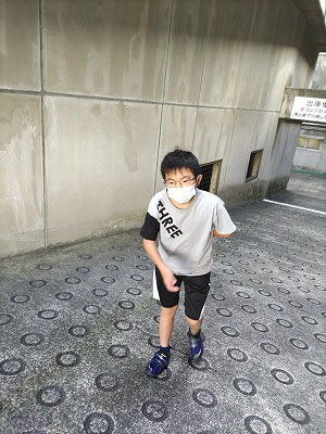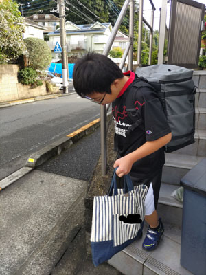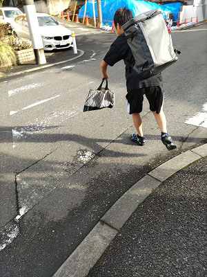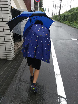 台風の影響で風雨強く、また荷物も多かったので、久々付き添い歩き。