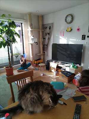 朝のひと時。 お母さんとの卓球。 と、球を狙うメイ。 |