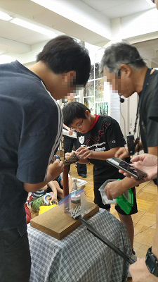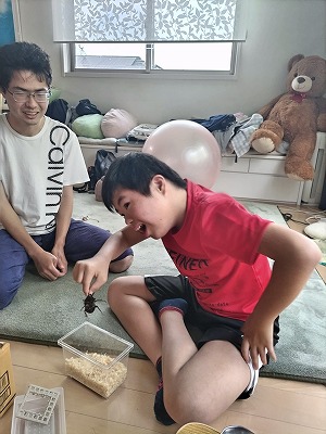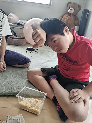 今日はいつも参加させて頂いているボランティアの会は、カブトムシ相撲。 今年はSもカブを狩りに行く時間がなく、レンタル個体。 |