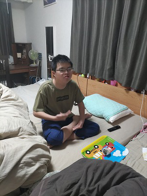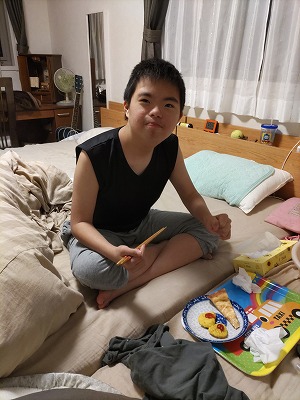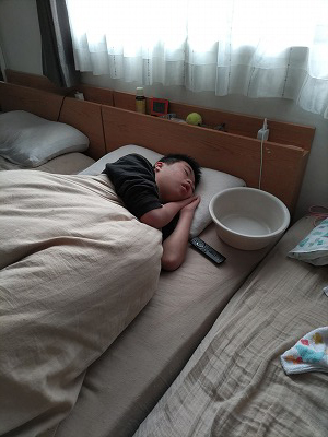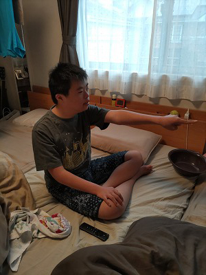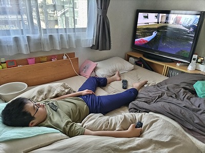 ![]() | H、ベッドで起き上がり、YouTube鑑賞。 |