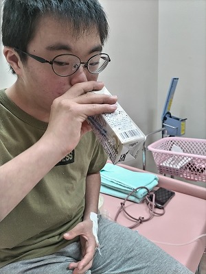 既に脱水症状があり点滴を入れたが、このまま水分が取れないと、また点滴が必要になる。