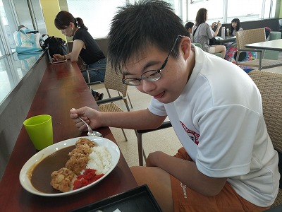プール後の昼食は、定番の唐揚げカレー。