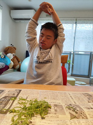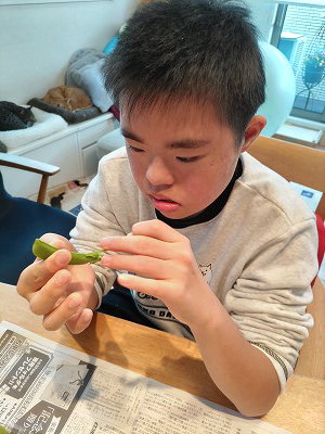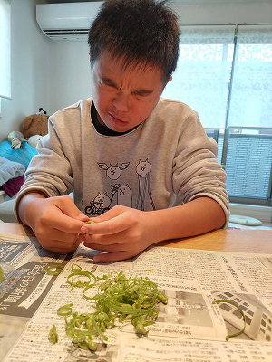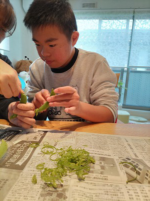 エンドウのスジ剥き。