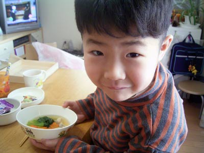 朝は雑煮。 餅は慣れずに殆ど食べられず。 |
