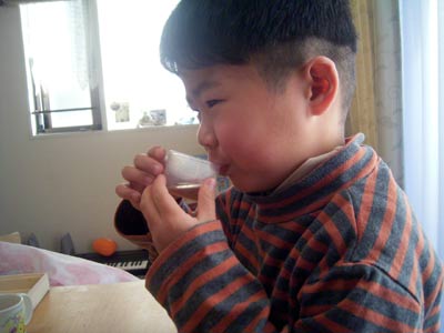 お屠蘇。 初アル○ール。 一口で「お゛ぅえ゛え゛え゛っ!」 と吐き戻しそうになっていた。 |