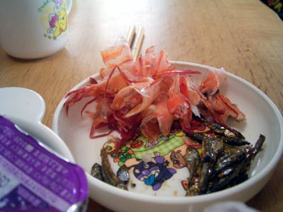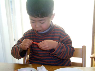 田作りを沢山取って意気揚々。 しかし一匹食べて、 「硬い・・・。」 何と勘違いしたのだろうか。 |
