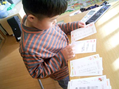 年賀状の仕分けを頼むも、 全く役に立たないS。 漢字は読めなくとも字の形でわかるだろうと思いきや、 これが不思議なほどできない。 パズルは得意だからできるだろうと踏んだのだが、 ちょっと意外だった。 |