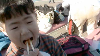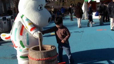 席を確保しておいて、餅つき大会に参加。 |