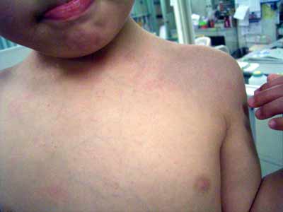 胸、横腹、お腹に発疹が。 痒そうだ。 今年になってから、まだ風呂に入ってないからな。 |